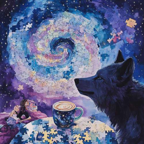 Surreal dreamscape, cosmic wedding scene, floating objects including a giant mug of hot chocolate, spiral galaxy, and an oversized wolf. Soft, ethereal lighting with hints of purple and deep blue. Foreground shows scattered puzzle pieces forming a partial image of a smiling face. Background transitions from cozy bedroom to vast starry space. Watercolor and ink style, slightly blurred edges.