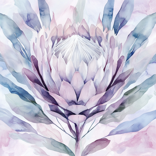 minimalist pattern watercolor protea flower of monochromatic symmetry, intricate storytelling, bloomsbury group, soft color aquarellist, cold palette color, flowing dinamic forms
