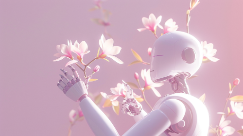 A sidebar image for a medspa AI chatbot website, showing a delicate, futuristic AI hand gently holding a blooming flower. The hand is sleek and white, with subtle golden accents, and the flower is a soft pink peony, symbolizing beauty and grace. The background is a soft blur of pastel colors, creating a sense of depth and serenity. The image conveys a balance between technology and natural beauty, perfect for a medspa context. hd quality, natural look, soft shadows, elegant design, pastel tones, gentle composition --ar 9:16 --v 6.0