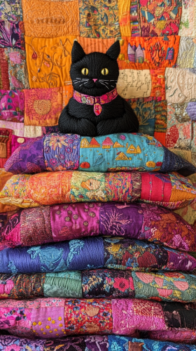 cute black cat on top of a pile of colorful fabric and pillows, in the patchwork style, in the style of Beatrix Potter, embroidery art with glitter threads --ar 9:16 --v 6.1