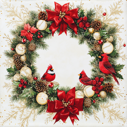 Create a beautiful Christmas Season rectangular fabric design that has wreath in the center is a very thick wreath made of noble pine tips that hoe up to the edge of the fabric. Embellish with a lot of red and green and gold baubles and a lot of red and white roses and glittered pine cones and red cardinals and a lot of iridescent white snowflakes and glittered stars. Wide red red satin bows and lots of coils of brass wire and a lot of white and red mini Christmas lights. The center and background is white iridescent sparkle fabric. The edges around the rectangle design is thick gold ruffles. --v 6.1