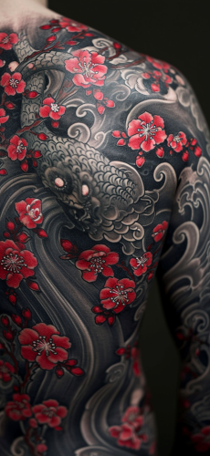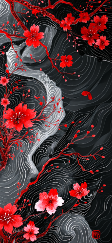 Ancient Japanese painting with red and black design, repeating pattern, gray and black, Tanya Shatseva, cherry blossom pattern, curves, use of fabric, dark shading --ar 59:128 --v 6.0