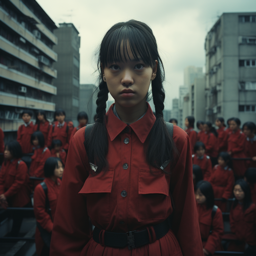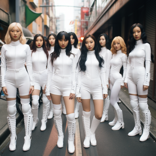 group of 15 asian beauty girls on Shanghai street wear white latex clothes