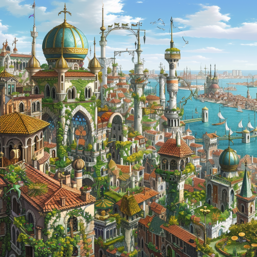 fabatsy art. A panoramic view of a fantasy city resembling a blend of Florence and Venice during the Renaissance period. The city is bustling with activity, showcasing a rich tapestry of architecture, including grand palaces, ornate domes, and intricate canal systems. Lush gardens and greenery are interspersed throughout the city, with vines crawling up the sides of buildings and hanging pots and planters adorning the streets. The skyline is dotted with majestic towers and spires, and the bustling docks are visible in the background, filled with ships of various sizes. The overall atmosphere is vibrant and lively, capturing the essence of a thriving, prosperous city in a fantasy setting. --s 50 --v 6.0