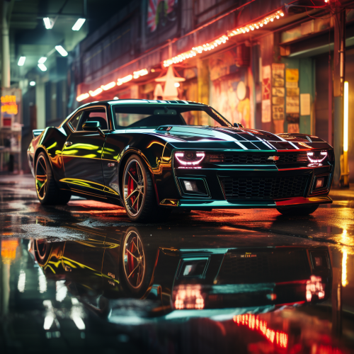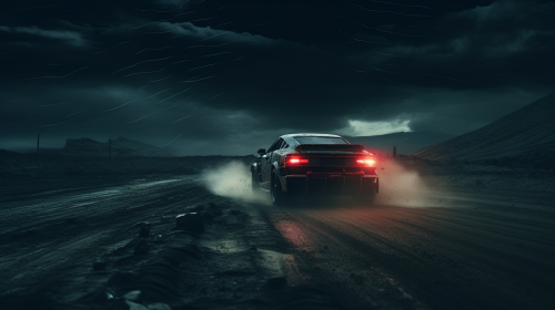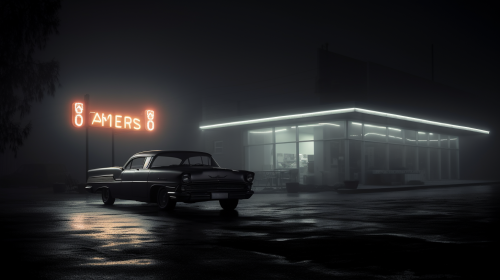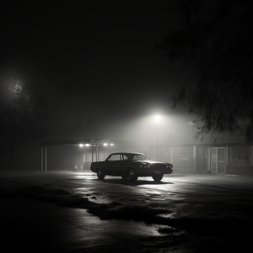 In a 4K resolution, envision a black and white poster for a classic dystopian noir movie set in the year 2030. A car parked in a motel parking lot gleams with neon lights. The background of the scene is shrouded in a soft mist --ar 16:9
