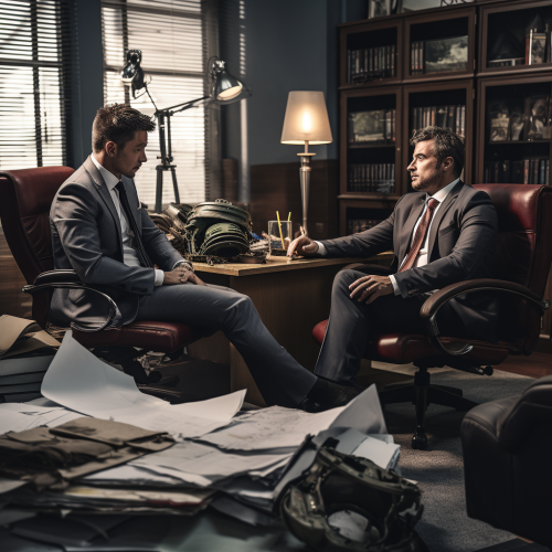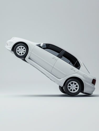 A close-up image of a car accident scene, focusing on the dented bumper and cracked headlight of a car. The ground is scattered with debris from the accident.