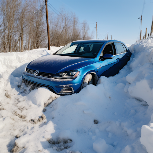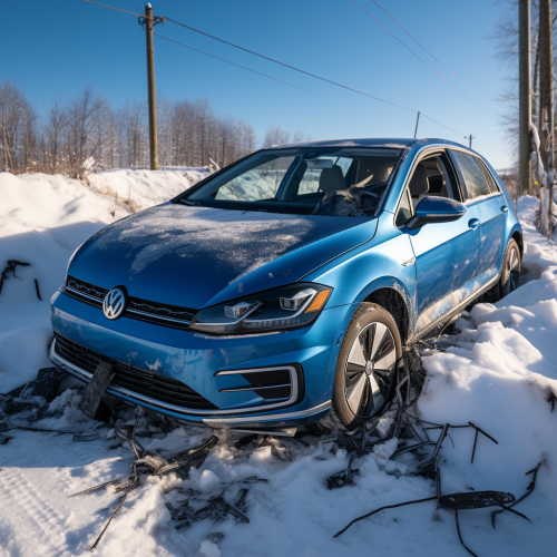 marine blue volkswagen golf electric 2021, crashed in the ditch, in a snowy road