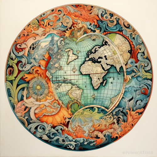 a 2d graphic resembling the same aesthetic, colors, patterns, design elements from traditional world maps/globes. The map should be of earth and have the outlines of the continents, etc except wherever it would have a title for an ocean write the words "watch world"
