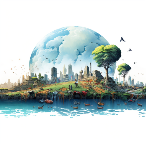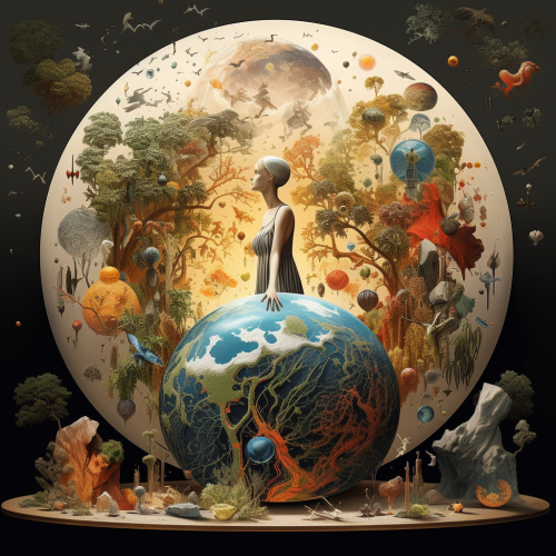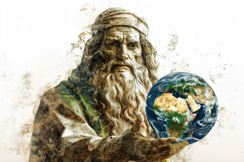 a photo realistic, high quality, high definition image of leonardo da vinci saving the planet earth, deep tech technologies, dark green, light olive green and beige color scheme, white background --ar 3:2 --v 6.0
