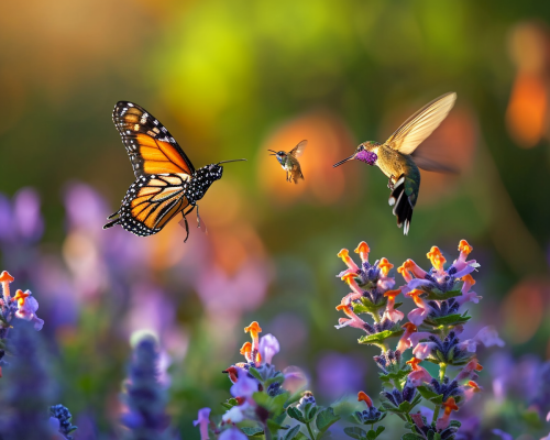 a website image of a bee, a hummingbird, and a monarch butterfly, environmental nonprofit, preservation --ar 5:4 --stylize 220 --v 6.0
