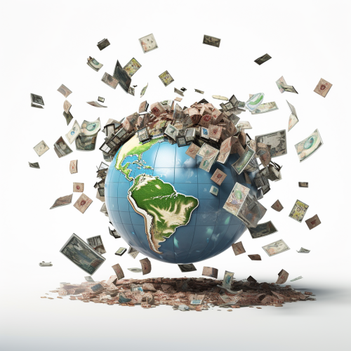floating earth surrounded by banknotes and rising stock market, sustainable companies, plain white background