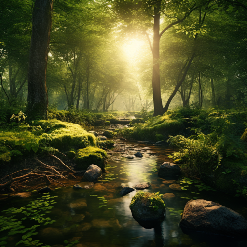 reallistic image of a very greeny forest and sunny Cultivating sustainability, conserving water, and growing greener tomorrows.