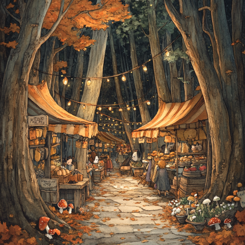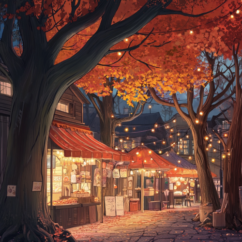 hand drawn japanese style vibrant cozy detailed market stalls are built into the trunks of the trees with string lights overhead fall leaves and mushrooms