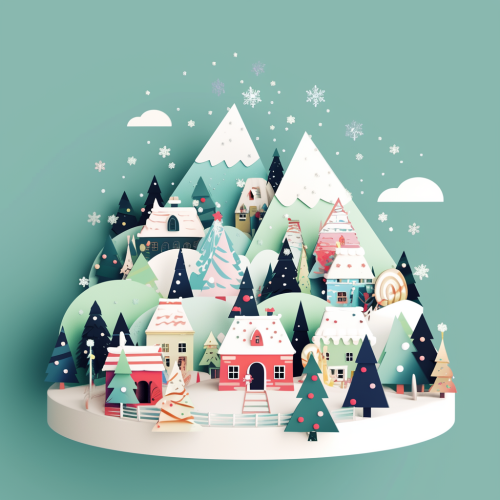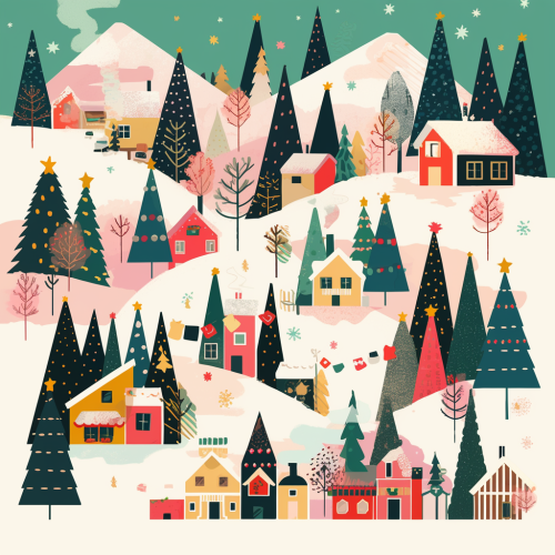 A cute and kawaii vintage mountain northern village under the snow. Spruce trees. Christmas vibes. Vibrant colors. Simple style. --s 50 --niji 6 --style raw