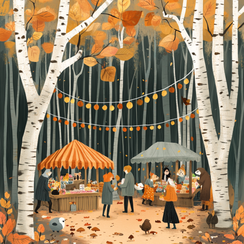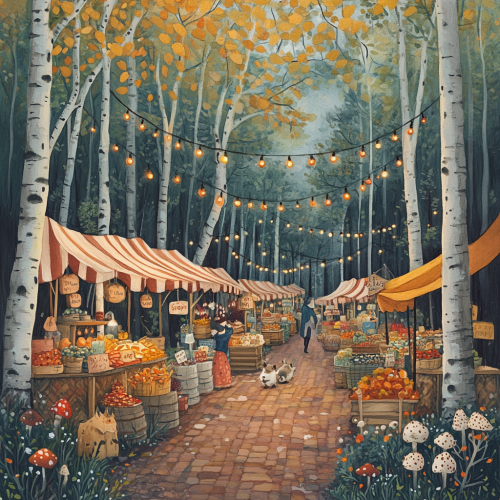 hand drawn vibrant detailed small clearing in a birch grove where market stalls are built into the trunks of the trees to resemble a cozy farmers market with string lights overhead fall leaves and mushrooms anthropromorphic forest animals shopping at the market