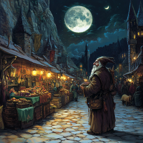 a dwarf selling curios in a medieval market at night, lots of vendor stalls, docks and cliffs in the backgroudn, thieves, two moons, style of fantasy art