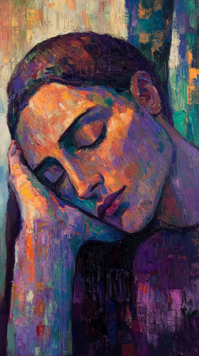 A figure with their eyes closed, hands resting calmly on the table, immersed in stillness peaceful, meditative, listening without listening style: Vincent Van Gogh, perspective: close-up, late afternoon, colors: deep purples, soft oranges, with subtle highlights on the figure's face, background: a dimly lit room with abstract brushstrokes on the walls, the shadows of the room creating a feeling of internal focus and solitude. --ar 9:16