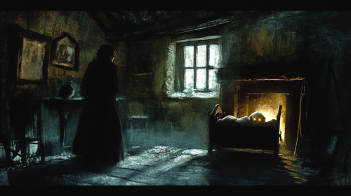 Illustrate a dimly lit, rustic Irish cottage interior where a distraught mother looks over a cradle. Inside, instead of her child, a wizened, eerie changeling with glowing eyes lies swaddled. Shadows from the fireplace flicker ominously on the walls, enhancing the mysterious and unsettling atmosphere. --ar 16:9