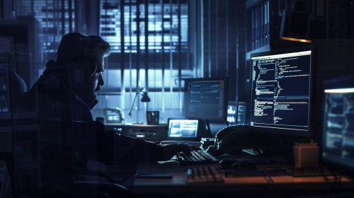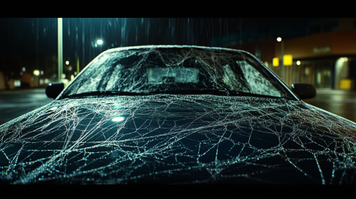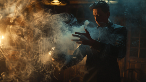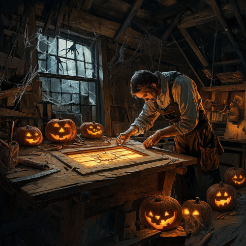 A spooky carpenter in a dimly lit workshop, carving aa window from wood. Cobwebs hang from the rafters, and jack-o'-lanterns flicker in the corners, casting eerie shadows