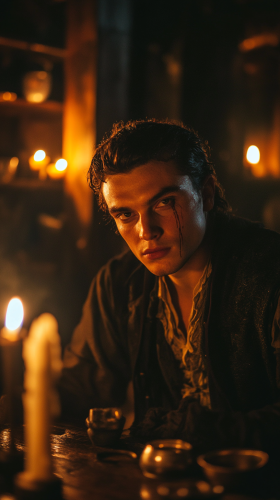 STYLE: Cinematic Close-Up | GENRE: historical drama | EMOTION: intrigue, decadence | SCENE: Disguised as a woman, Heliogabalus sits in a dimly lit tavern, his face adorned with makeup, eyes scanning the room with an air of fascination and mischief. The candlelight flickers over his face, adding a touch of mystery to his gaze as he prepares to engage in his unorthodox pursuits. | TAGS: 8k, warm candlelight, emotional complexity, historical realism, immersive close-up, decadent atmosphere | TIME: Late night | LOCATION TYPE: Tavern interior | CINEMATOGRAPHER: Emmanuel Lubezki | --ar 9:16