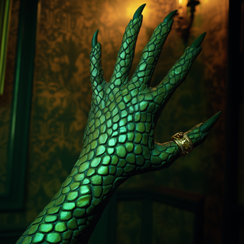 a hand with long pointy scary fingers, the entire hand is green snake scales, its claymation , theres a gold super bowl ring on one finger, the hand is all you can see in a dimly lit scary room