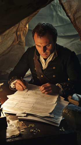 15. Furthermore, according to Napoleon, many had already been captured, a thoughtful scene of Napoleon reviewing a list, 1799, in a dimly lit tent with a single candle, a table cluttered with papers and a map in the background, medium shot emphasizing his concentration, hyper-realistic, photo realism, cinematography --ar 9:16