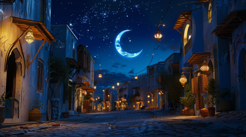 Algerian street in the middle of the night with moon crescent --ar 16:9 --v 6.0 --s 250