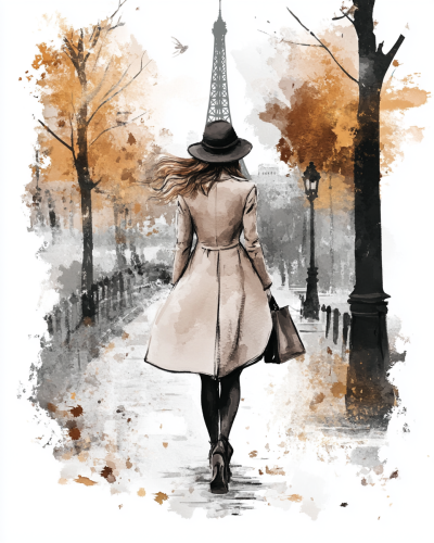 poster, an illustration of sophisticated women gossiping and drinking tea, a space above for text, women in white and beige, background places the eiffel tower. jordi labanda style, geige palette --ar 4:5