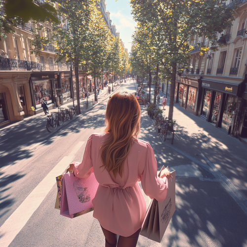 A realistic photo of a brunette in a pink blouse walking down the street in Paris holding shopping bags. She’s wearing a pink blouse and sunglasses. There are a ton of trees on this street. The camera angle is from above.