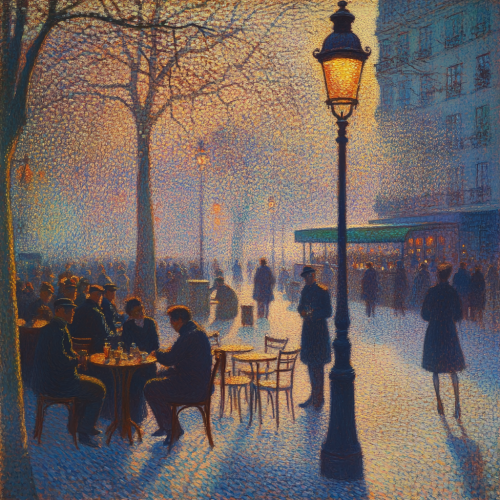 a painting of Georges Seurat in a scene in Paris, Lights on in the late afternoon, people at tables talking and drinking coffee, blue, terracotta and cane green. electric. dry trees with long dry branches. shadows of people on the ground are long. old lamp posts, in the style of holographic, rococo pastel colors, early computer art, transparent/translucent medium, decorative relief, steinheil quinon 55mm f