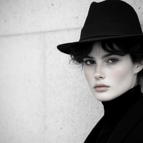 set against a minimalist background in paris. The style is inspired in the style of Peter Lindberg, focusing on detailed facial expressions and stylish attire. Soft lighting creates shadows, highlighting textures like glossy skin. This composition evokes high-fashion elegance and modernity, with a focus on form and color contrast, full body shot, black and white