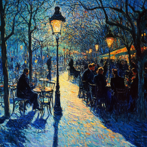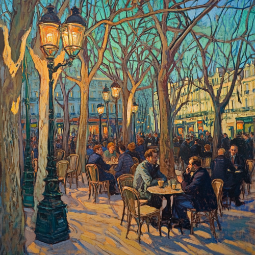 a painting of Lautrec in a scene in Paris, Lights on in the late afternoon, people at tables talking and drinking coffee, blue, terracotta and cane green. electric. dry trees with long dry branches. shadows of people on the ground are long. old lamp posts, in the style of holographic, rococo pastel colors, early computer art, transparent/translucent medium, decorative relief, steinheil quinon 55mm f/1.9 --v 6.1