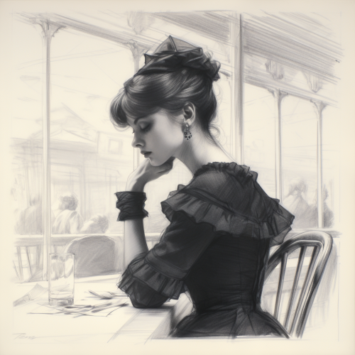 a portrait pencil drawing of a edwardian lady sitting alone in a paris cafe, drawing by Paul Cesar Helleu