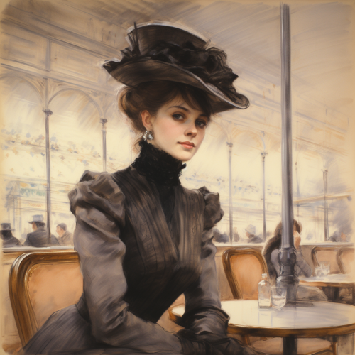 a portrait ink drawing of a edwardian lady sitting alone in a paris cafe, ink drawing by Paul Cesar Helleu