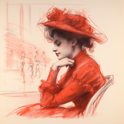 a portrait red ink drawing of a edwardian lady sitting alone in a paris cafe, red ink drawing by Paul Cesar Helleu