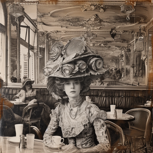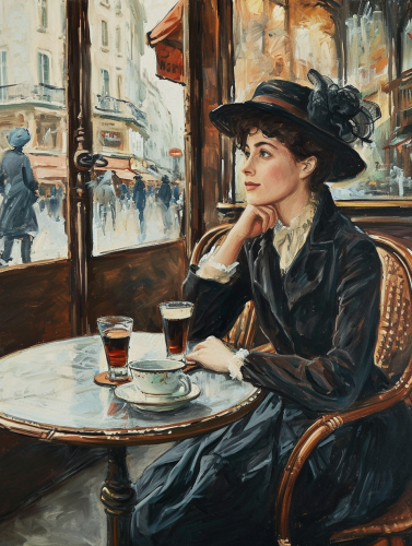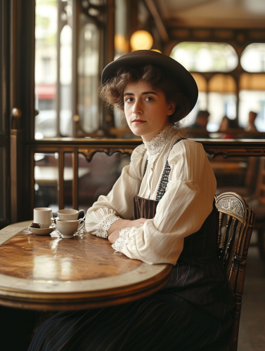 portrait of an edwardian woman in a art nouveau Paris cafe, --ar 3:4 --v 6.0