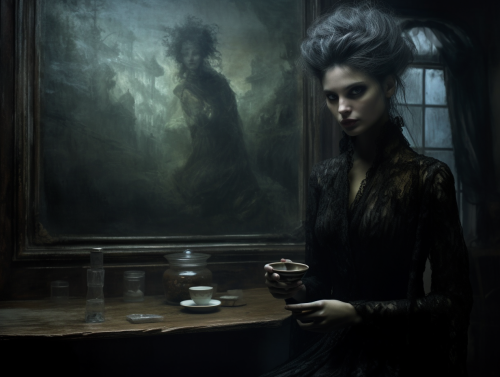 in the style of Agostino Arrivabene edwardian woman in a paris cafe, black art nouveau, cool dark color, decadent, moody, ominous doom, opulent, dark gothic --ar 4:3 --uplight --v 5.2