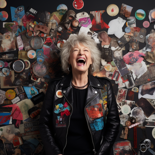 A portrait of a 60 year old woman wearing a black leather jacket, remembering at her life full of cherised memories and experiences, in a photography studio against a white background, the background contains a collage of memories and objects from her life exploding from behind her, three quarter shot, joyful and colourful mood