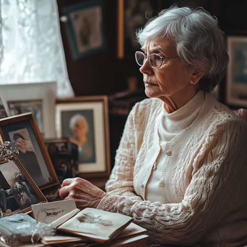 An elderly person sitting in a serene, softly lit room, surrounded by personal mementos and photographs, with a distant, reflective expression on their face. Gentle lighting, warm pastel colors, soft textures, and a subtle blur or haze to symbolize memory loss. Incorporate elements of compassion or caregiving, such as a hand on the shoulder or a book labeled 'memories' on the table. Emotional yet peaceful mood, focused on empathy and care.