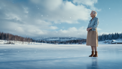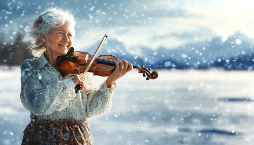 Fashion shoot for clothes, a smiling old woman dressed in classy light summer clothes holdinga violin , dressed in shirt and dress , is standing full figure on a frozen lake, Norwegian winter landscape, beautiful sunny afternoon with snow falling, 65 mm, photorealistic, fashion photo shoot for Vogue magasine, uhd image, 8k, in the style of saturated colorism, --ar 7:4 --style raw --stylize 50 --v 6.1
