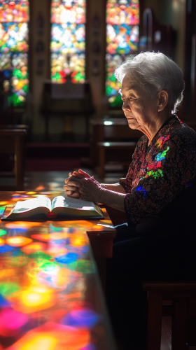 An elderly Korean woman, 86 years old, sitting at a church altar desk with her hands clasped in prayer. In front of her, there is an open Bible resting on the desk. The interior of the church is bright and welcoming, with soft sunlight filtering through stained glass windows, casting colorful patterns on the floor. The atmosphere is serene and spiritual, evoking feelings of peace, hope, and faith. --ar 9:16
