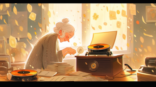 a picture using a splotchy watercolor style. An elderly woman, standing in her living room bathed in soft sunlight, surrounded by floating musical notes that sparkle like stars. Each note seems to glow with its own soft, radiant light, representing the music she cherished. The room is full of sentimental details: an old record player, photos of loved ones, and mementos of the past. The warm tones and delicate brushstrokes emphasize the brightness of the memories, as if the music itself lights up her world.. --ar 16:9 --niji 5