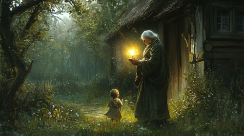 Show an elderly wise woman intervening to save a child from being taken by fairies. She stands firm at the threshold of a cottage, holding a talisman that radiates light, warding off the approaching fairies who hover at the edge of the forest. The child, held tightly in the mother’s arms, is surrounded by a protective aura --ar 16:9