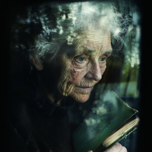 The elderly woman is seated in front of an old monochrome monitor, the faint hum and flicker of the screen casting a subtle glow over her weathered face. The light from the screen is tinted with a soft, muted green--Fern-Green--a color that blends with the faded green of the notebook she clutches in her lap, its cover frayed from years of handling. Her deeply lined face is captured in profile, her eyes fixed on the screen with a mix of resignation and quiet reflection. The hazel of her eyes is faded, almost blending with the green hue of the screen, giving them a spectral quality as if the light from the monitor is drawing out the memories she holds within. Her hair, silver and thin, is pulled back into a bun, catching the greenish light in soft strands that shimmer faintly against the muted background. The artist renders her face with meticulous detail, emphasizing the deep lines and creases that tell the story of a life marked by hardship and endurance. Each wrinkle is a testament to her resilience, and the slight distortion in the portrait--her features slightly elongated by the play of light and shadow--suggests the weight of the memories that the screen draws from her. The background is kept intentionally blurred, the focus entirely on the woman and the interaction between her and the screen. The soft green light from the monitor merges with the darker tones of her worn coat, creating a sense of unity between her figure and the world she is observing. The notebook, though small, is rendered with a subtle glow, the green of its cover harmonizing with the overall color scheme, symbolizing the connection between the stories she holds and the images playing out before her. Her expression is one of quiet dignity, with just a hint of sorrow, as if she is both [...]