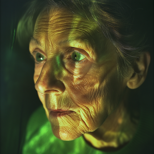 Elderly woman with green monitor reflection\n