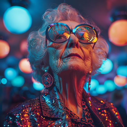 electronic music, disco ball and this old woman in bright tones futuristic shaped glasses is wearing heels, in the style of ebru sidar, leo putz, elke vogelsang, agfa clack, futuristic, portrait, zany, neon tones, electronic music party, --v 6.0 --s 250
