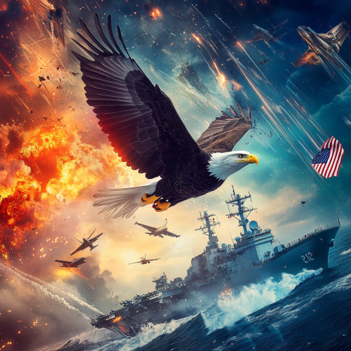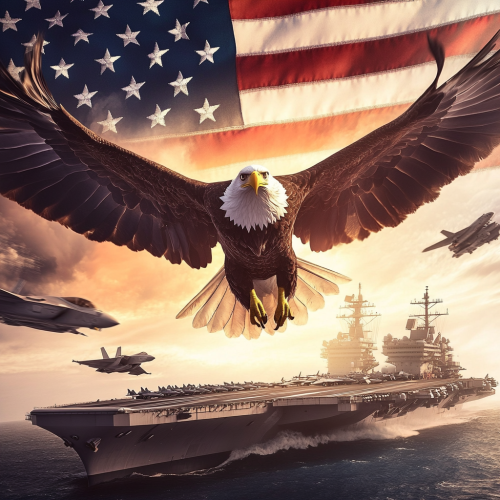 a website header with an eagle flying out towards you, an american flag behind the eagle, and US military weapons like destroyers, aircraft carriers, F-35s, tanks, etc --style raw --s 50