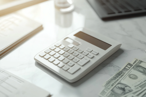 Real-life image of an elegant calculator with a variety of currency denominations neatly laid out on a clean desk, symbolizing planning and preparation for future financial risks, modern and refined atmosphere. Photorealistic, realistic photo, 8K resolution --ar 3:2 --v 6.1 --style raw