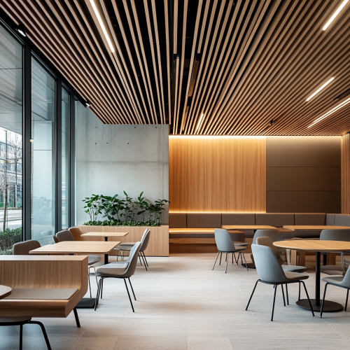 Enhance a gallery and lobby space within a modern mass timber building, focusing on aesthetics without altering structural elements like windows. Keep the existing wooden ceiling slats and add soft, warm ambient lighting to highlight the natural wood. Refine the café area with minimalist, comfortable seating and tables arranged to encourage social interaction, ensuring an open flow. Add subtle wall-mounted art or sculptures to create a gallery-like atmosphere. Introduce a few indoor plants to bring warmth and life into the space, maintaining a cohesive, contemporary design that complements the current layout and structure