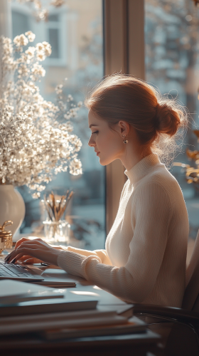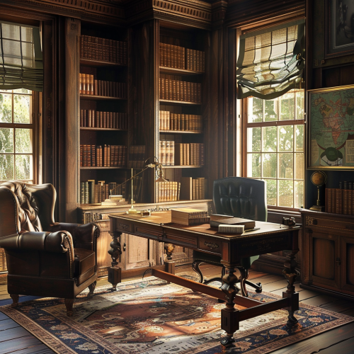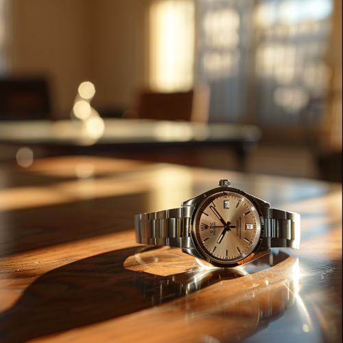 A luxury wristwatch resting on a polished wooden desk with a soft focus. Elegant lighting casts shadows from a nearby window, highlighting the craftsmanship. The background shows a blurred modern home office in neutral tones. Created with Canon EOS, natural lighting, hd quality --v 6.0
